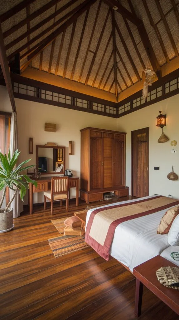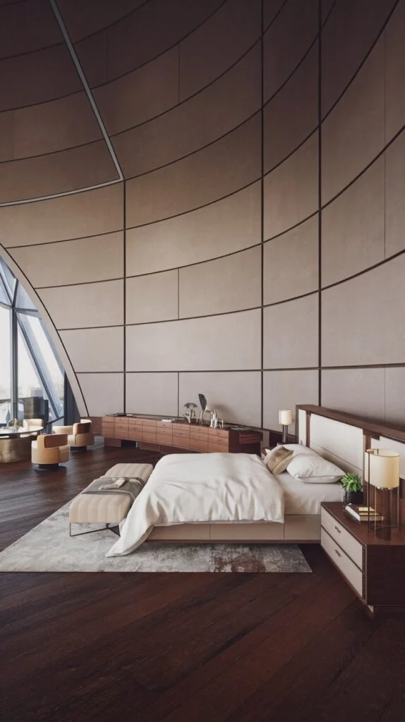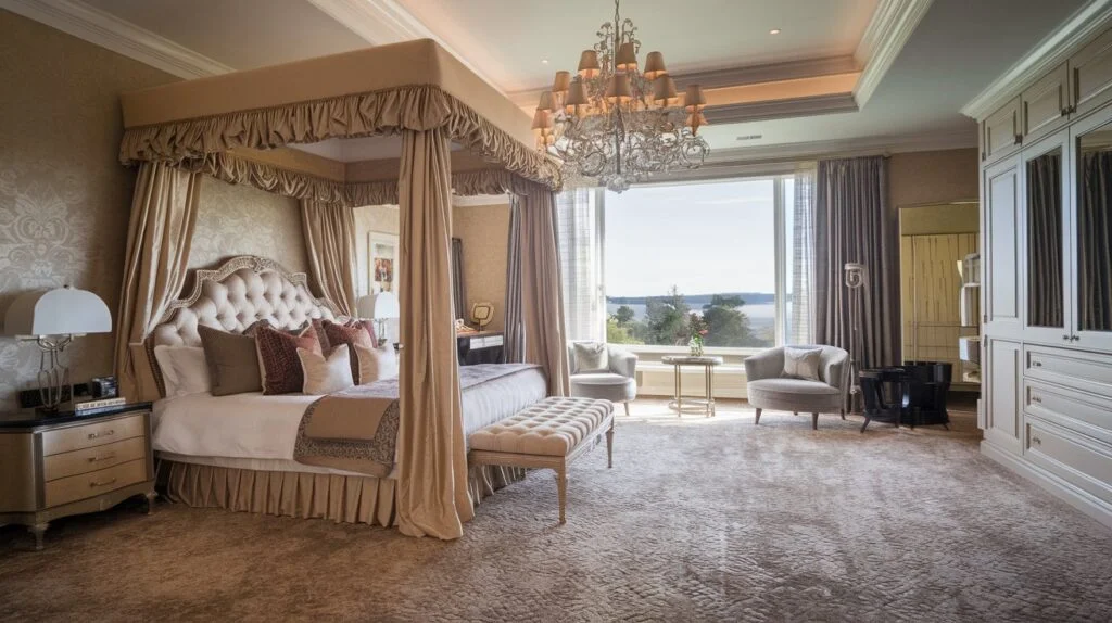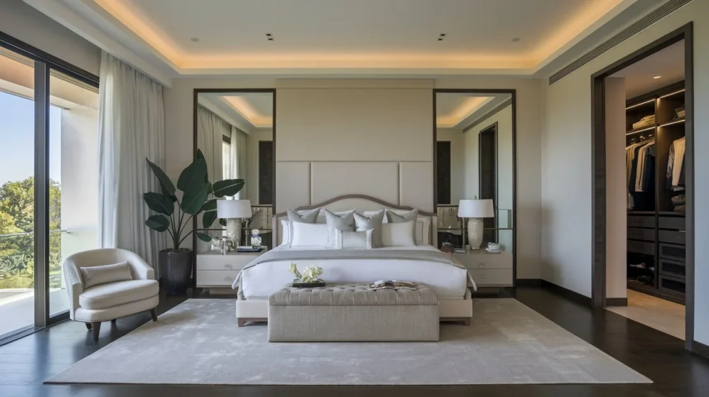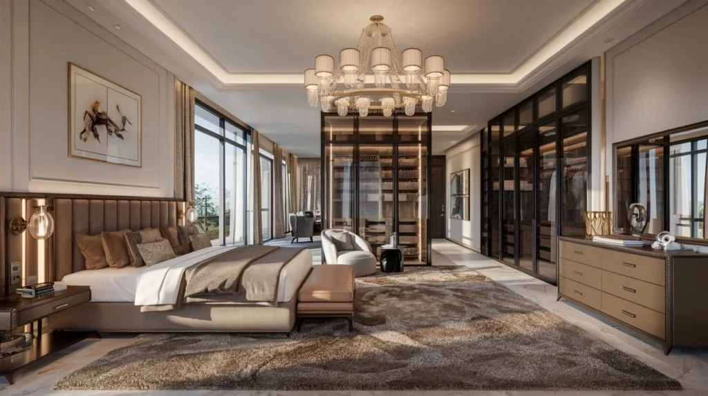 High-end materials like Egyptian cotton sheets, oak furniture, and crystal lighting fixtures are essential in defining luxury in bedroom interior design. Hardwood flooring or high-quality carpets can add warmth and sophistication, while quality lighting fixtures made of crystal or premium metals contribute to the luxurious atmosphere.