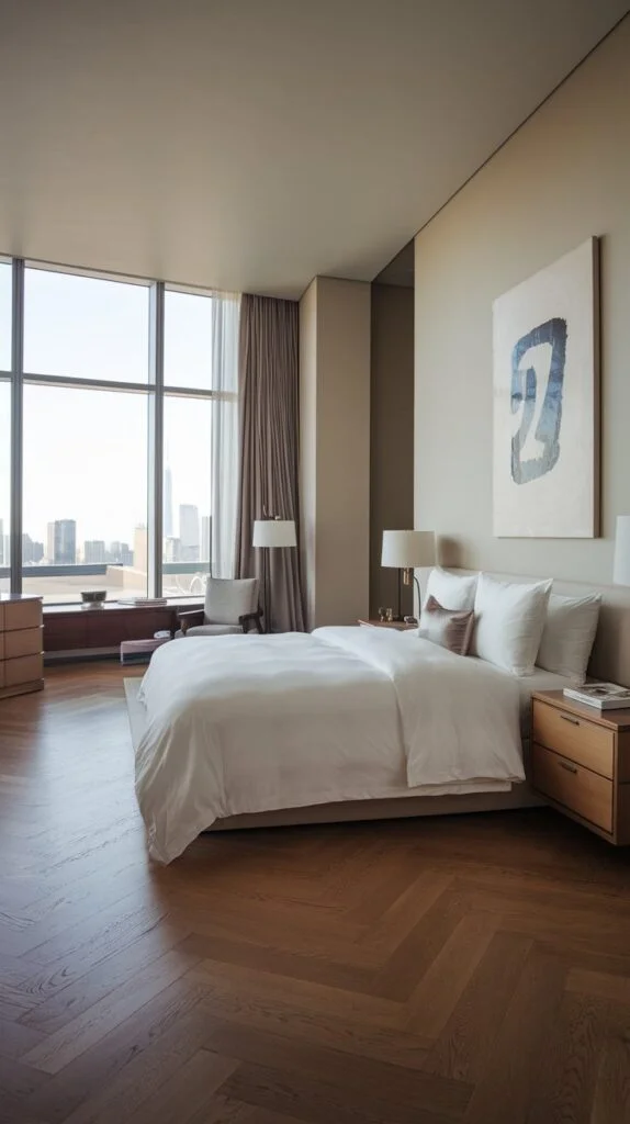 Investing in high-quality bedding materials, such as down comforters, high-thread-count sheets, and plush pillows, can also enhance the overall bedroom aesthetics. Layering with soft, textured elements like rugs, throw blankets, and decorative pillows can further contribute to the luxurious feel of the space.