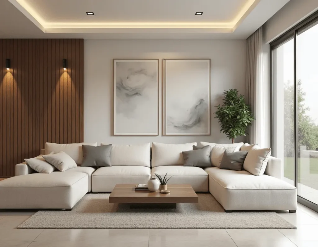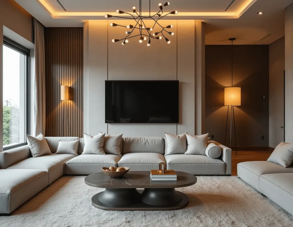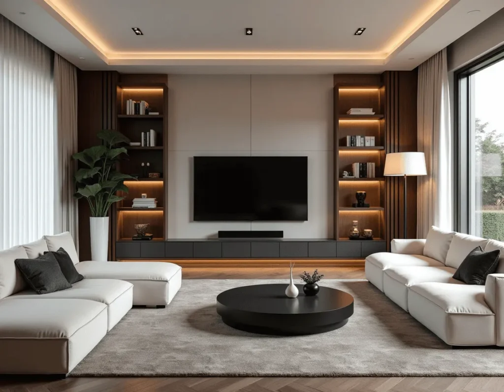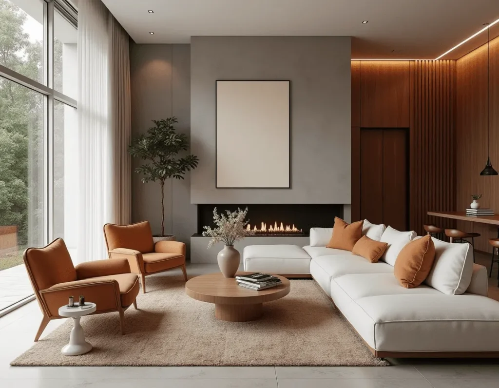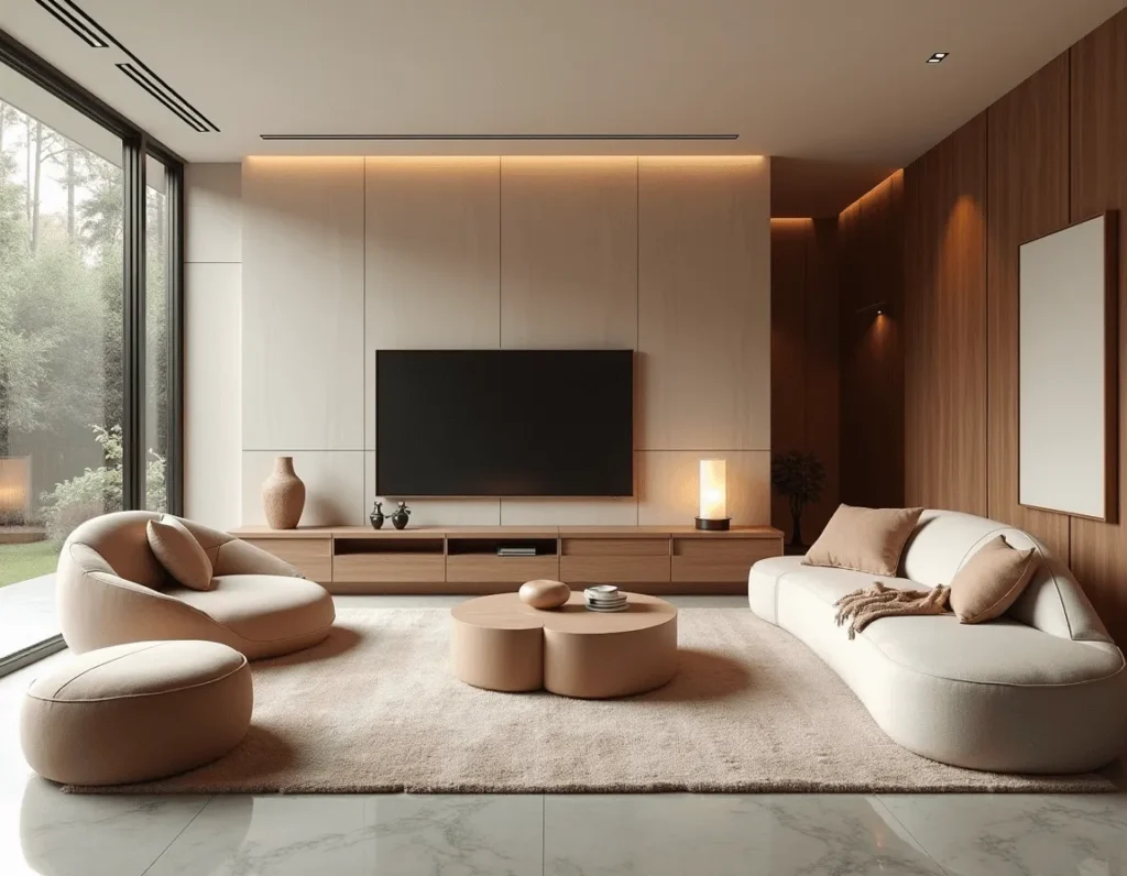Modern living room design steers clear of high contrasts. Here, a layered neutral palette — soft whites, warm browns, and muted greys — creates a calm, cohesive feel with just enough tonal variety to keep things from falling flat.