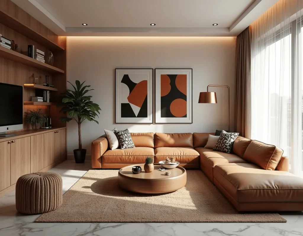 Modern living room design doesn’t overdo it on the artwork — no gallery wall sprawl or cluttered frames. One bold piece or a pair of graphic prints is enough to set the mood. Here, simple geometric shapes add a playful edge while echoing the orange and brown tones in the furniture. It’s curated, not chaotic — a modern family room idea with just the right contrast of fun and structure.