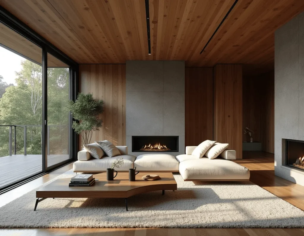 Here, two slim white sofas face each other, naturally showcasing the striking marble fireplace and glowing linear insert. Underfoot, a subtly textured rug and square wood coffee table frame the space and play with brown tones, guiding the eye upward to a beautiful wood-paneled ceiling. It’s quiet and clever, which is exactly the kind of balance that defines a well-designed contemporary living room.