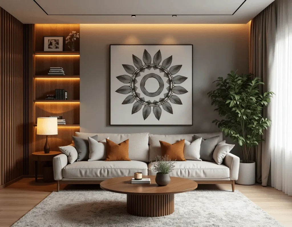 Symmetry spells out curated in big, bold letters, bringing a sense of intentional order and calm. In thisliving room design, aU-shaped sectional sofa, square rug, and centered coffee table collectively serve as a strong visual anchor, while matching artwork above the couch reinforces the balance. Paired wall sconces and a large plant introduce just enough asymmetry to break the rigidity without disrupting the room’s feng shui.