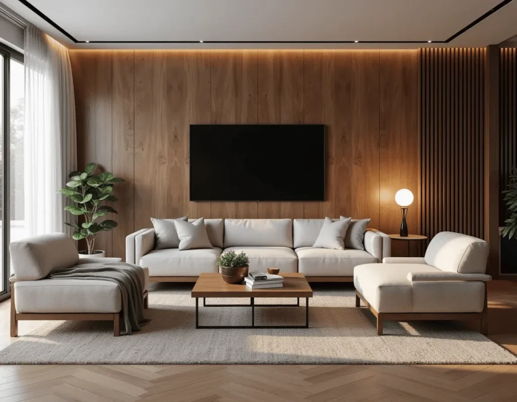 Modern Design loves a material mix — not to show off but to keep you looking at the unassuming but effective interior design details. Here, warm wood takes the lead across the floorboards, wall paneling, and even the sofa andarmchair legs. Quiet contrasts (slim metal legs on the coffee table and a stone planter) cool things down just enough. On the surface, the design palette is cohesive, but subtle modern decor ideas add depth.