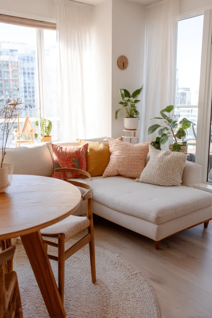 This cozy small living room features a light beige sectional sofa adorned with colorful throw pillows, creating a welcoming and relaxed atmosphere. The round wooden dining table, finished in a natural tone, sits beside large windows draped with sheer white curtains.