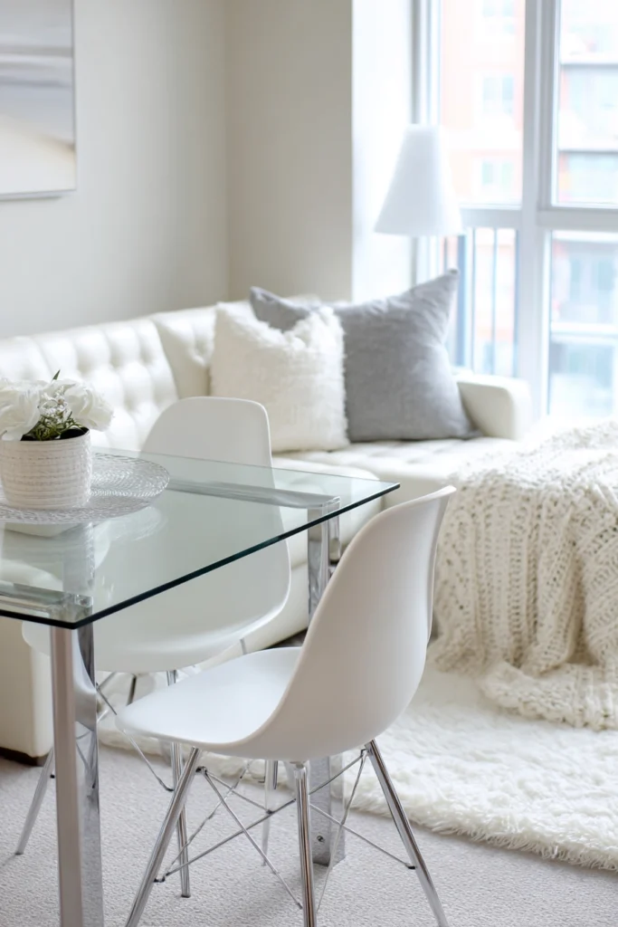 This minimalist small living room idea showcases a neutral color palette of whites and greys, creating an open and airy feel. A sleek white sofa paired with a glass dining table and modern chairs exemplifies the simplicity that defines minimalist design.