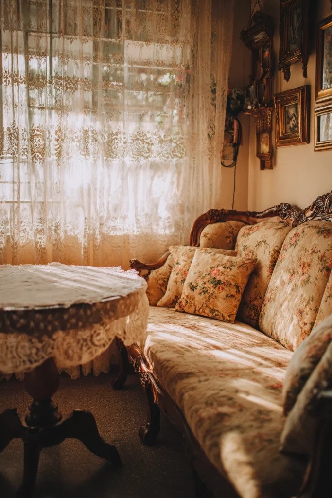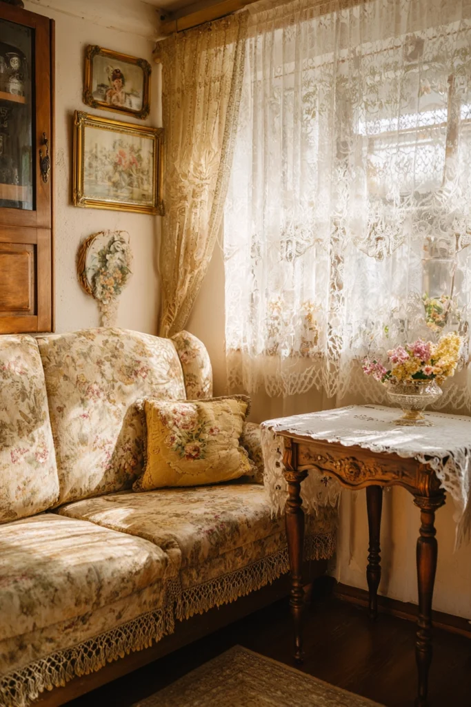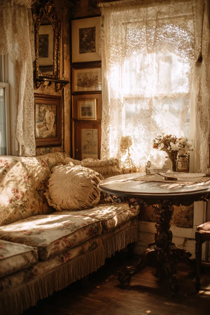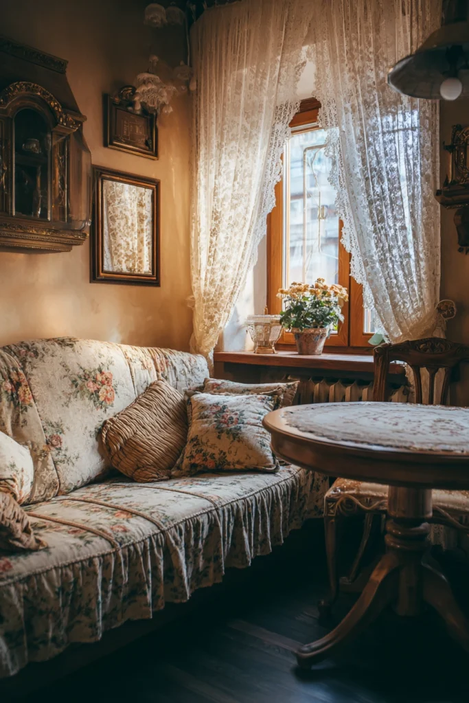 This small living room designed in vintage chic style features a faded floral sofa paired with a quaint wooden dining table showcasing ornate detailing. Warm golden light filters through lace curtains, enhancing the cozy ambiance.