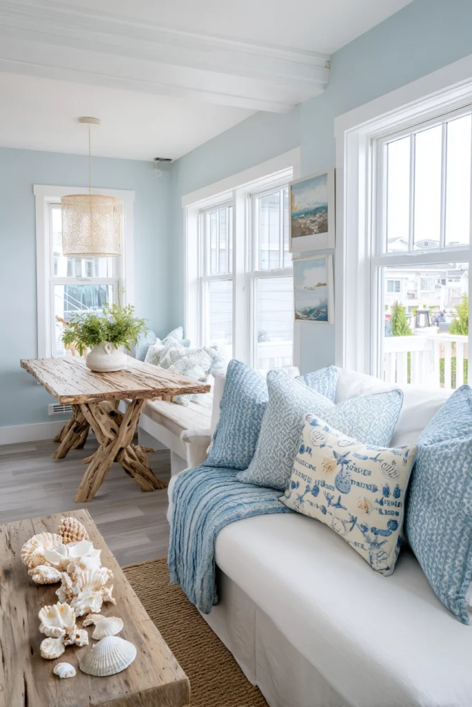 Seashell accents scattered around enhance the coastal theme, and natural light streaming in enhances the airy feel, making the space feel fresh and inviting.