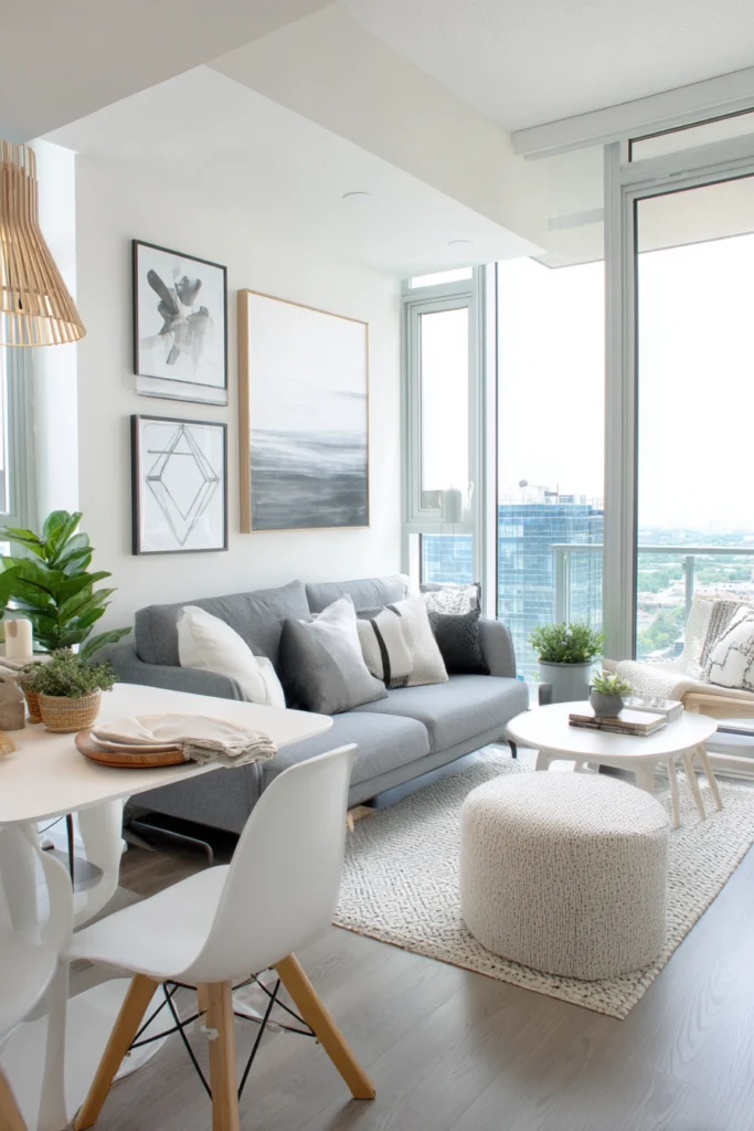 This modern small living room idea features a sleek design highlighted by a low-profile grey couch paired with a minimalist white dining table and stylish chairs. The space is accented with contemporary art pieces and geometric decor, adding a touch of sophistication.