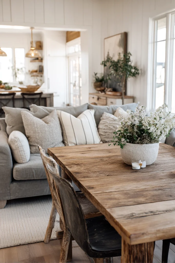 The combination of reclaimed wood and soft fabrics enhances the cozy atmosphere, making it perfect for family gatherings or casual dinners with friends. The natural light streaming in from a nearby window further elevates the overall vibe, illuminating the textures of both the furniture and decor.