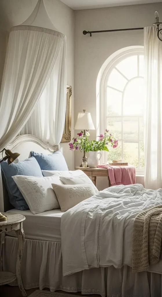 A romantic, French countryside-inspired bedroom with vintage linens, distressed wood, and soft natural light.