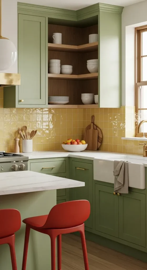 A bright kitchen corner with pistachio, butter yellow, and tomato red accents, reflecting 2025’s food-inspired color trend.