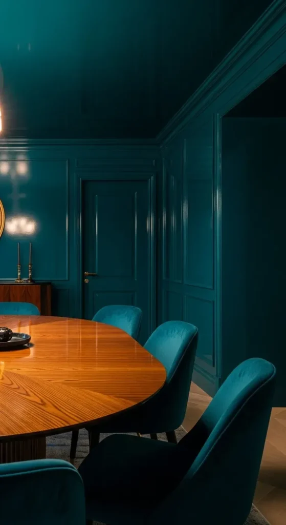 A bold dining room with deep teal walls and cohesive decor, showcasing the color drenching trend for 2025.